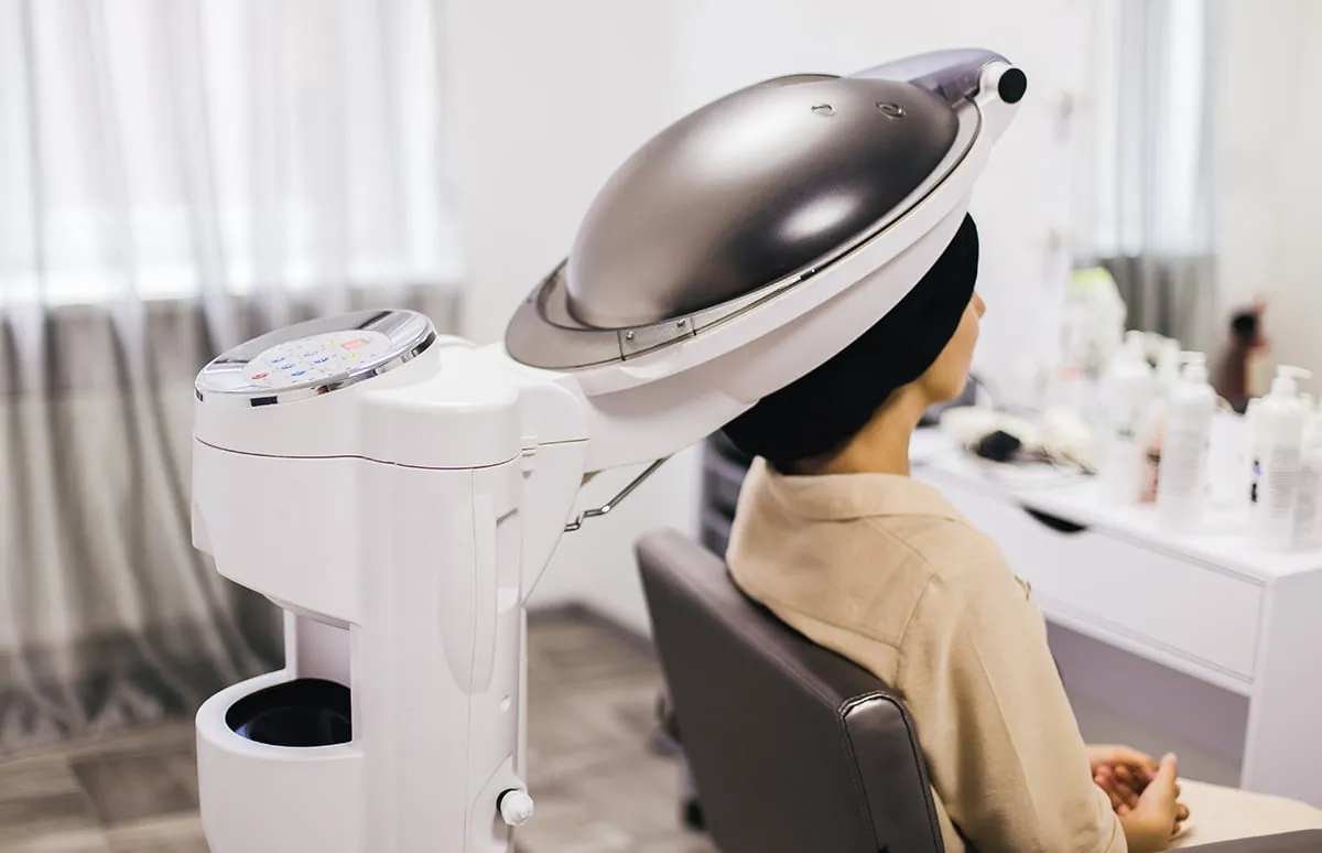 Ozone Steam Machine seansı – 15–25 dəqiqə ərzində baş dərisinə ozon buxarı tətbiq olunur.